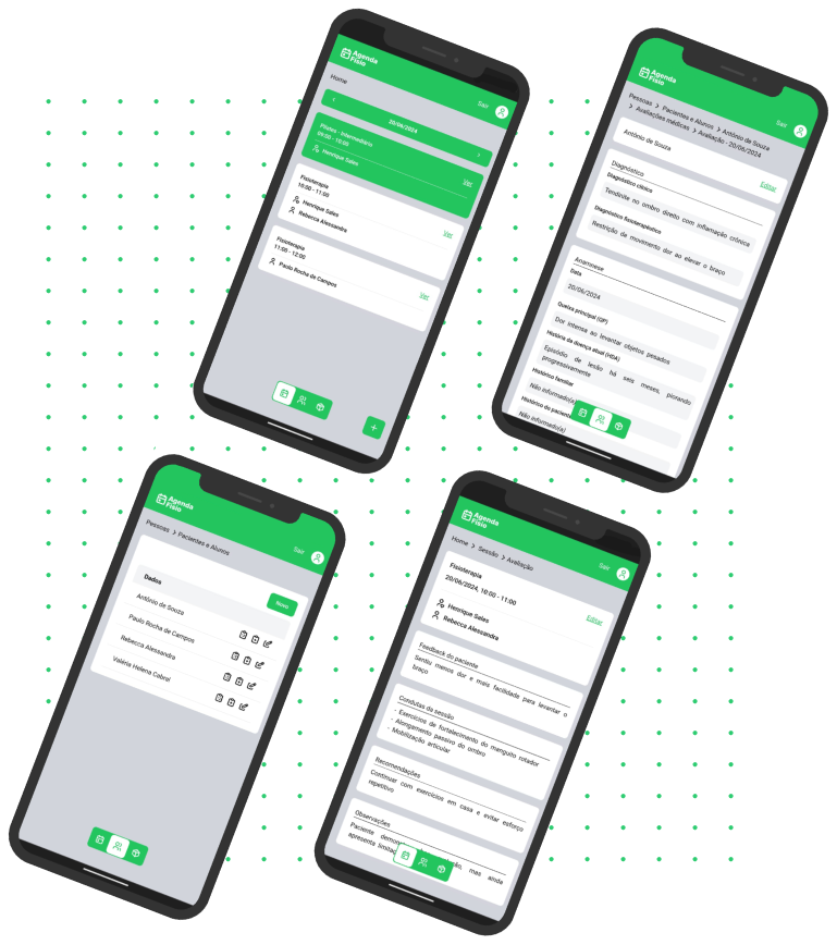 Agende consultas, gerencie, avalie e acompanhe o progresso de cada paciente de forma simples e intuitiva.
